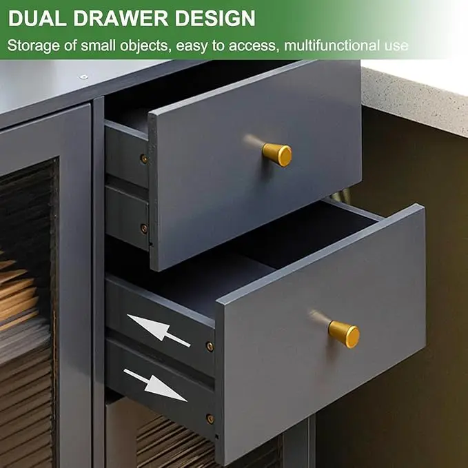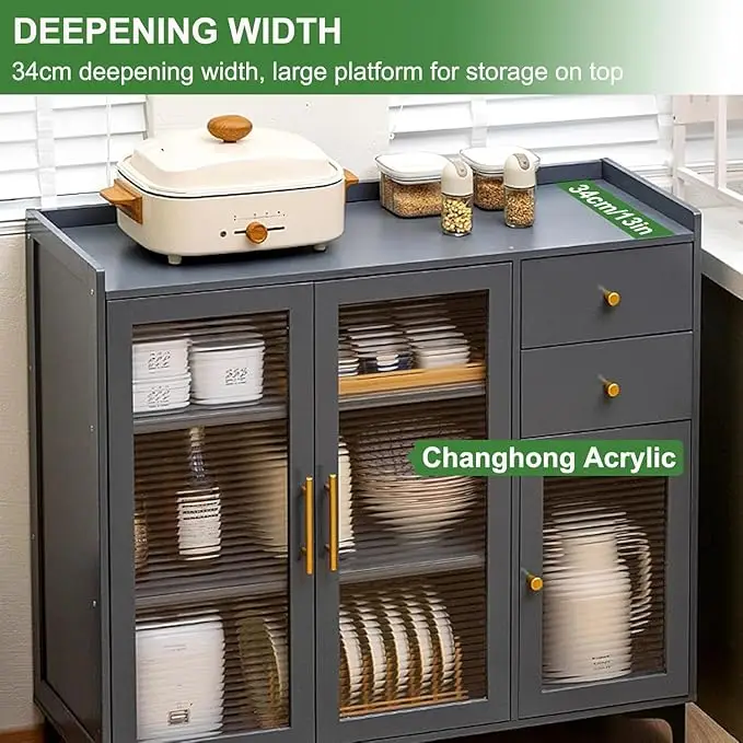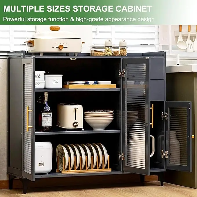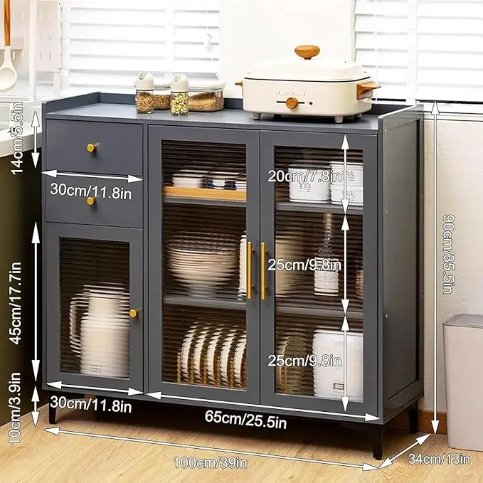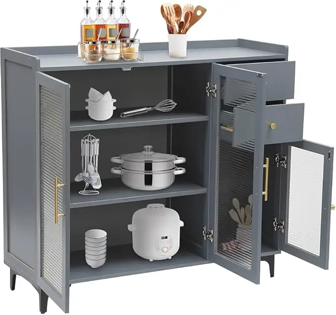Upgrade your kitchen or dining space with this stylish and spacious Modern Sideboard Cabinet. Crafted with a sleek matte grey finish, tempered glass doors, and gold accent handles, this buffet unit offers ample storage with a combination of open shelves, drawers, and closed cabinets. Designed for functionality and style, itβs perfect for storing dinnerware, small appliances, groceries, and kitchen accessories. Ideal for modern homes, this unit brings elegance and order to your living space.