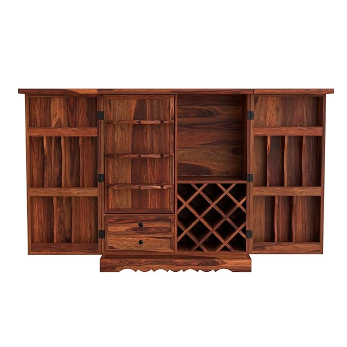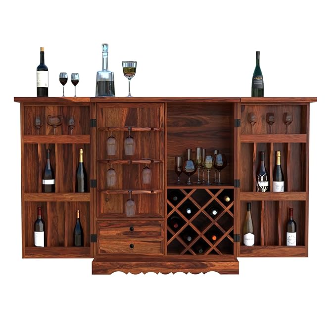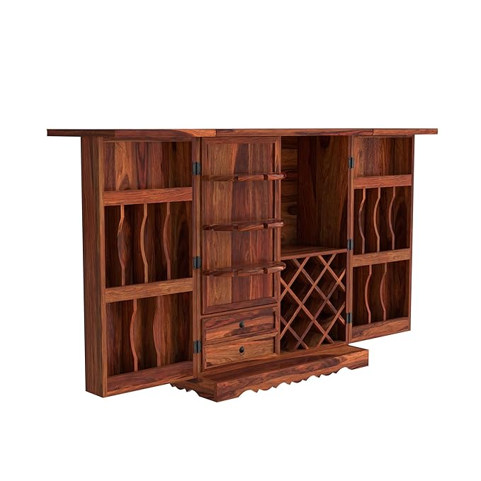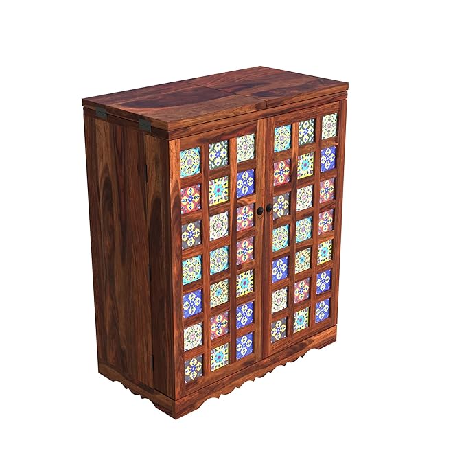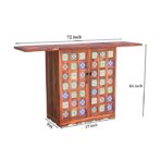 Add a splash of vibrant tradition and modern functionality to your home with this Sheesham Wood Bar Cabinet featuring exquisite hand-painted ceramic tiles. Designed for both style and storage, the cabinet includes a foldable top that extends your serving space up to 72 inches, making it the perfect mini bar for entertaining guests.