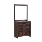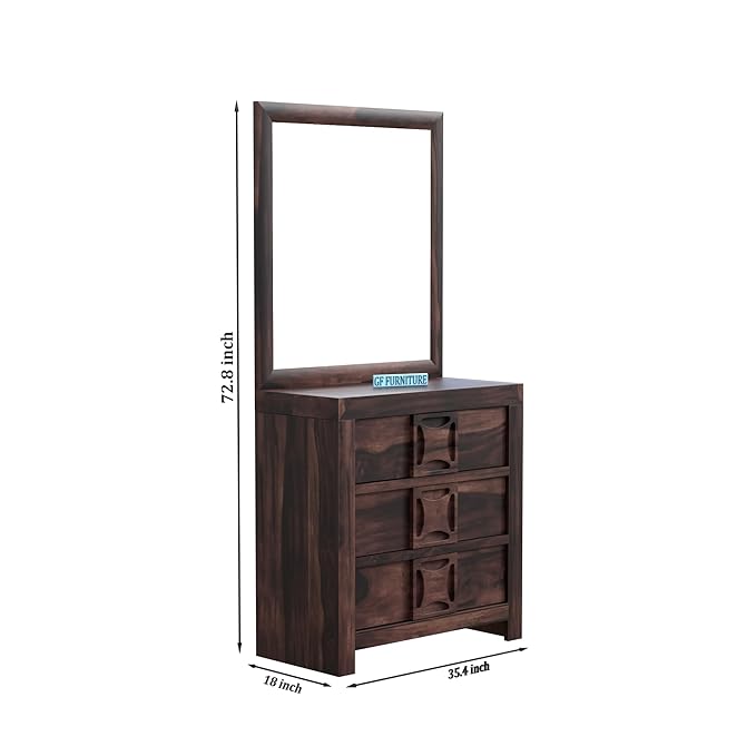 Add elegance and practicality to your bedroom with this Solid Sheesham Wood Dressing Table featuring a full-size mirror and three spacious drawers. With a rich walnut finish and unique carved handle design, this vanity table combines modern aesthetics with traditional craftsmanship. Whether you’re styling for the day or organizing your essentials, this unit offers the perfect blend of form and function.