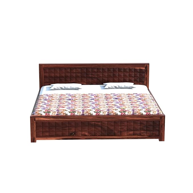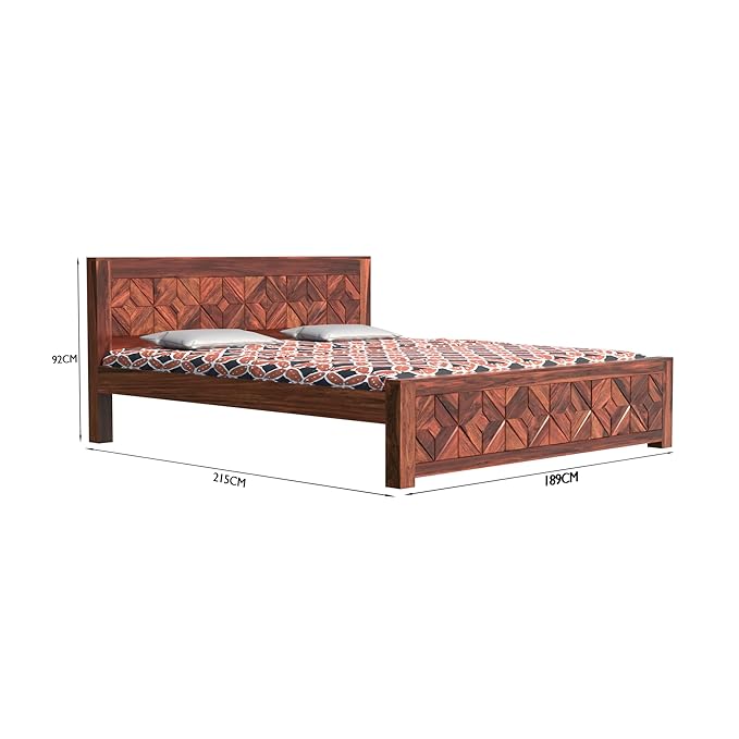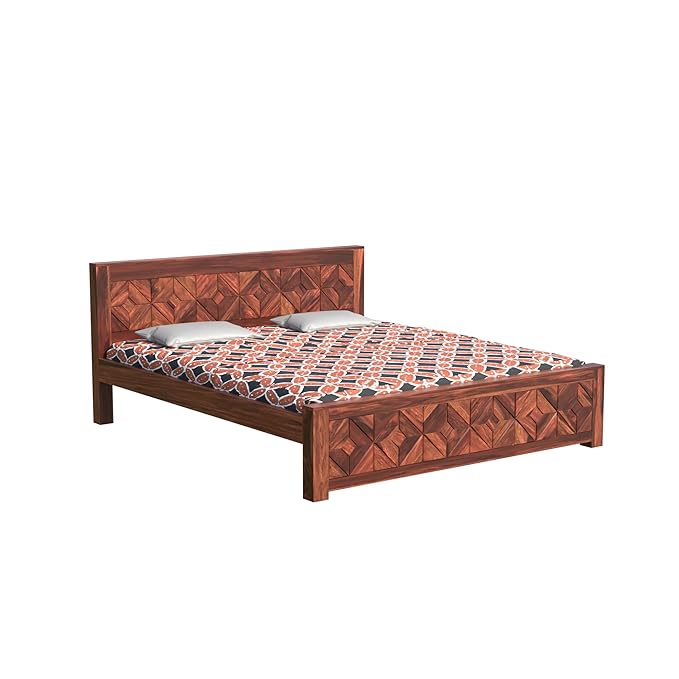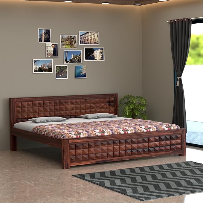 Add timeless charm and bold elegance to your bedroom with this beautifully handcrafted solid Sheesham wood double bed. Designed with intricate geometric patterns on both the headboard and footboard, this king-size bed is a perfect fusion of traditional craftsmanship and modern minimalism. With its rich walnut finish and robust structure, this bed provides a cozy and luxurious sleeping experience. The natural wood grain and polished texture enhance the aesthetic appeal, making it a standout piece in any home interior.