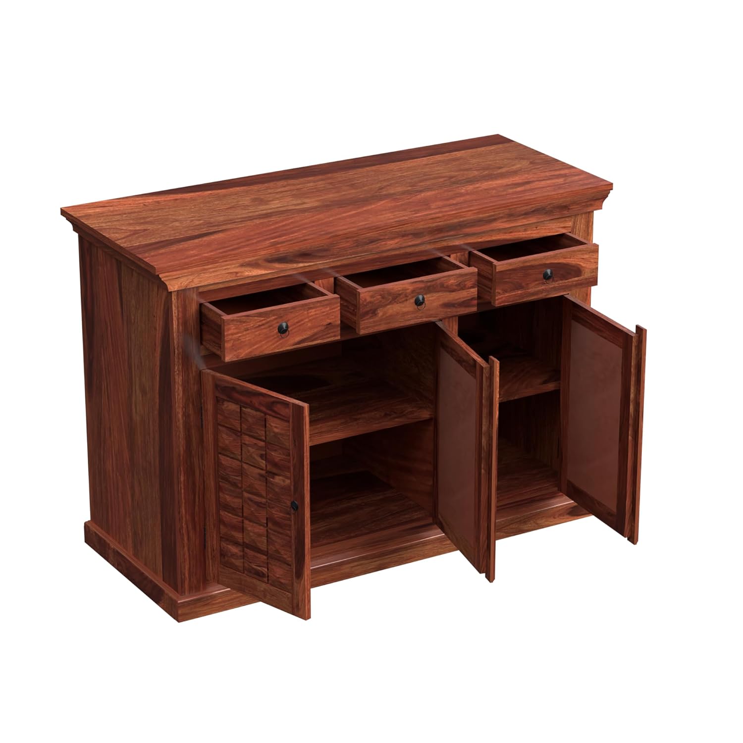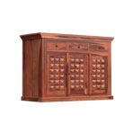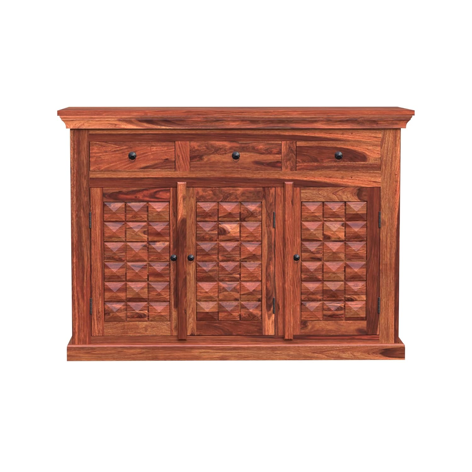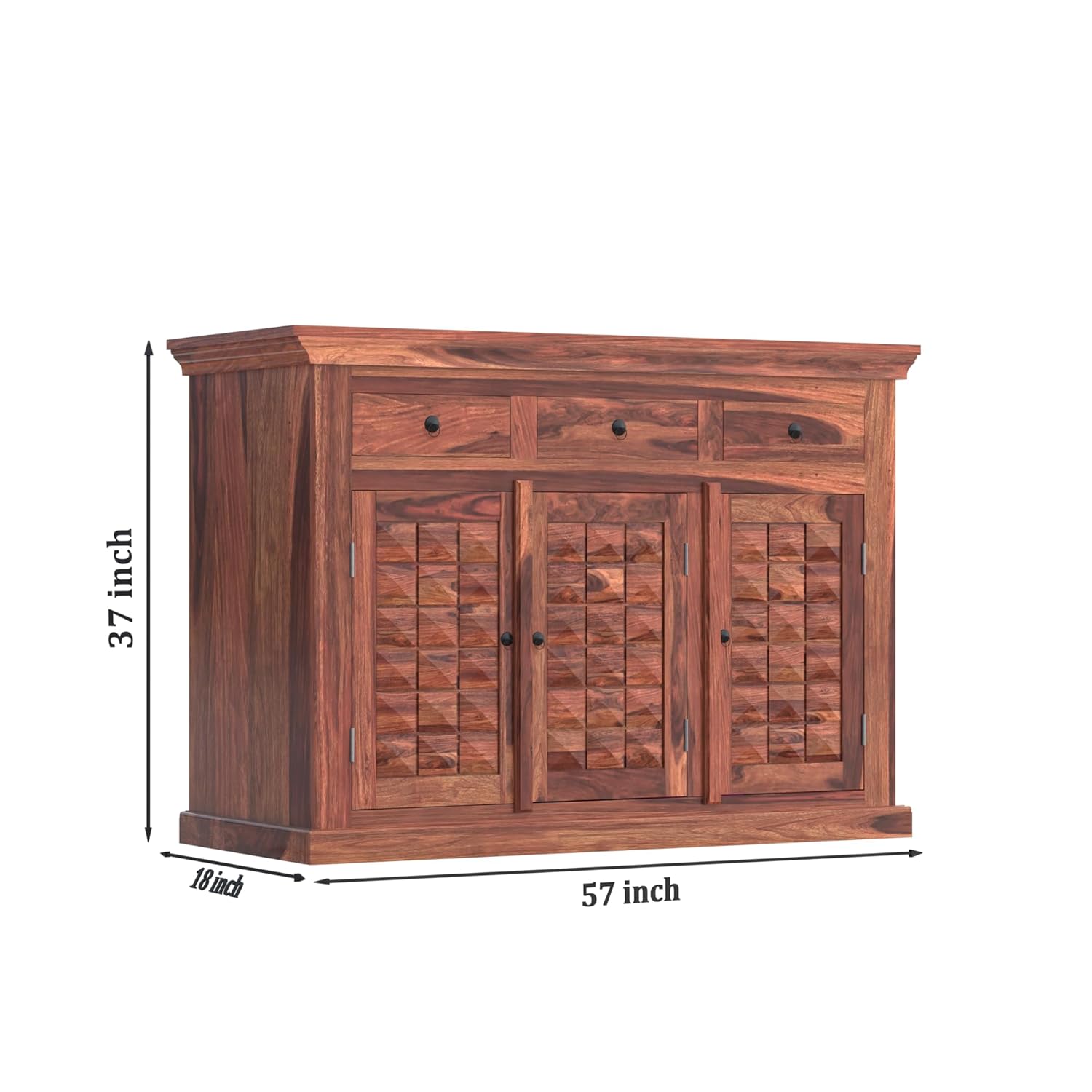 Enhance your home’s aesthetic with this handcrafted Solid Sheesham Wood Sideboard Cabinet, a perfect blend of functionality and artistry. Designed with an intricate hand-carved geometric pattern on the front doors, this elegant storage unit adds warmth and sophistication to any room. Featuring three spacious drawers and three closed cabinets, this sideboard offers ample storage for your essentials—be it kitchenware, dining accessories, books, or personal items.